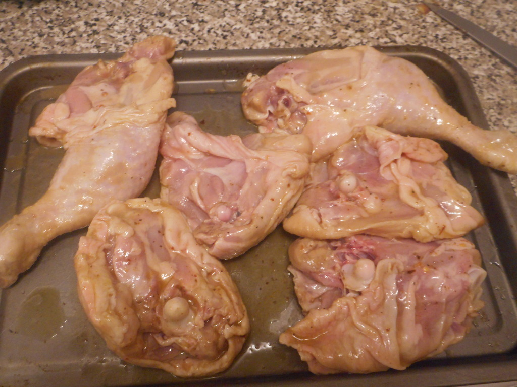 I had these compiled bottles of spice mixture lying around my kitchen, probably for literally years, left by some housemate. I had no use for them, I don't normally use stuff like this. One day they annoyed me so much I decided to try and use them. So I adapted some marinade recipes for boned chicken: piri-piri marinade for chicken thighs, and five spice marinade for chicken drumsticks. Marinated them for one day and then attempted several ways of cooking them. I have a combination oven and grill. The five spice drumsticks were done in the oven and mostly worked out nicely. They go well with the new potatoes and salad, as shown in the pic. The piri piri marinade didn't go so well. I forgot to pierce the chicken before, so the marinade was barely detectable. [I suppose the spice was probably already extremely weak, having languished for years in my kitchen.] But worse, I couldn't find any way to cook it through. I think my oven is generally not very powerful, because everything that I cook in it seems to end up underdone. The piri piri thighs, I grilled for a long time and yet they just didn't cook, I was highly squicked as I gingerly poked the rubbery grey flesh. I eventually got some advice from my sister, and pre-baked them for 30 minutes and finished them for 20 minutes on the grill. Even then they were far from crisp, although quite edible with chips. So I wouldn't call these a success (the final piri piri chicken aren't shown here).